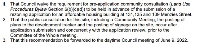 June 3, 2022: Mayor Helps has forwarded a motion for consideration and ratification by Council next week. The motion proposes the co-mingling of the Montreal/Kingston/Quebec “Tower” proposal and the redevelopment of 131/135/139 Menzies and the waiving of the Community Meeting for the Menzies project. Councillor Liaison Stephen Andrew wishes to seek your views on this, in a timely manner. To facilitate opportunities for residents to speak to him, prior to Mayor and Council’s decision on this matter.